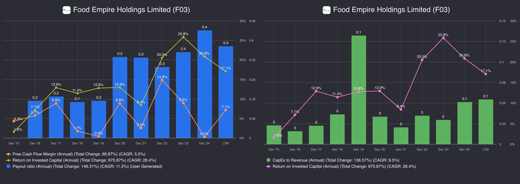 Food Empire now reinvests capital at rates well above its cost of capital, validating the moat’s durability.