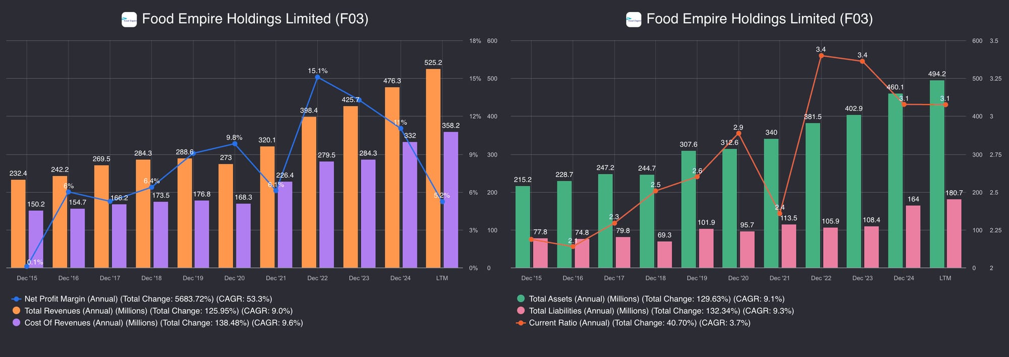 Food Empire has evolved from a low-return operator into a high-return, self-funding growth engine. ROIC rose from 1.6% in 2015 to a 2023 peak of 25.8%, normalizing to 17.1% LTM. ROE similarly reached 19.2% in 2023.