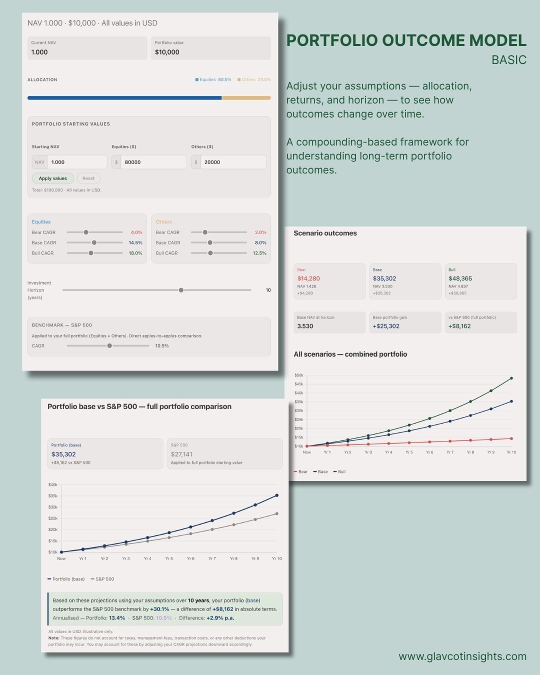 All figures are hypothetical and based solely on user-defined inputs. Past performance is not indicative of future results. No output from this tool should be treated as a definitive or guaranteed forecast of future portfolio value. Glavcot LLP accepts no liability for any financial decisions made, directly or indirectly, in reliance on the outputs of this tool.