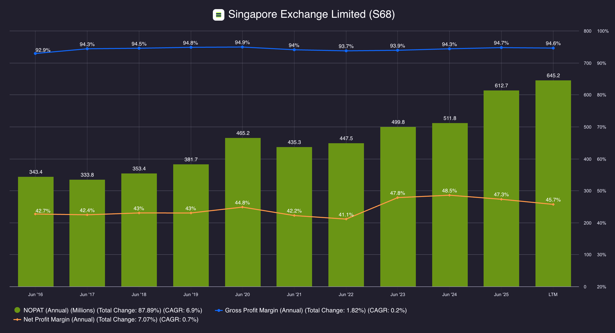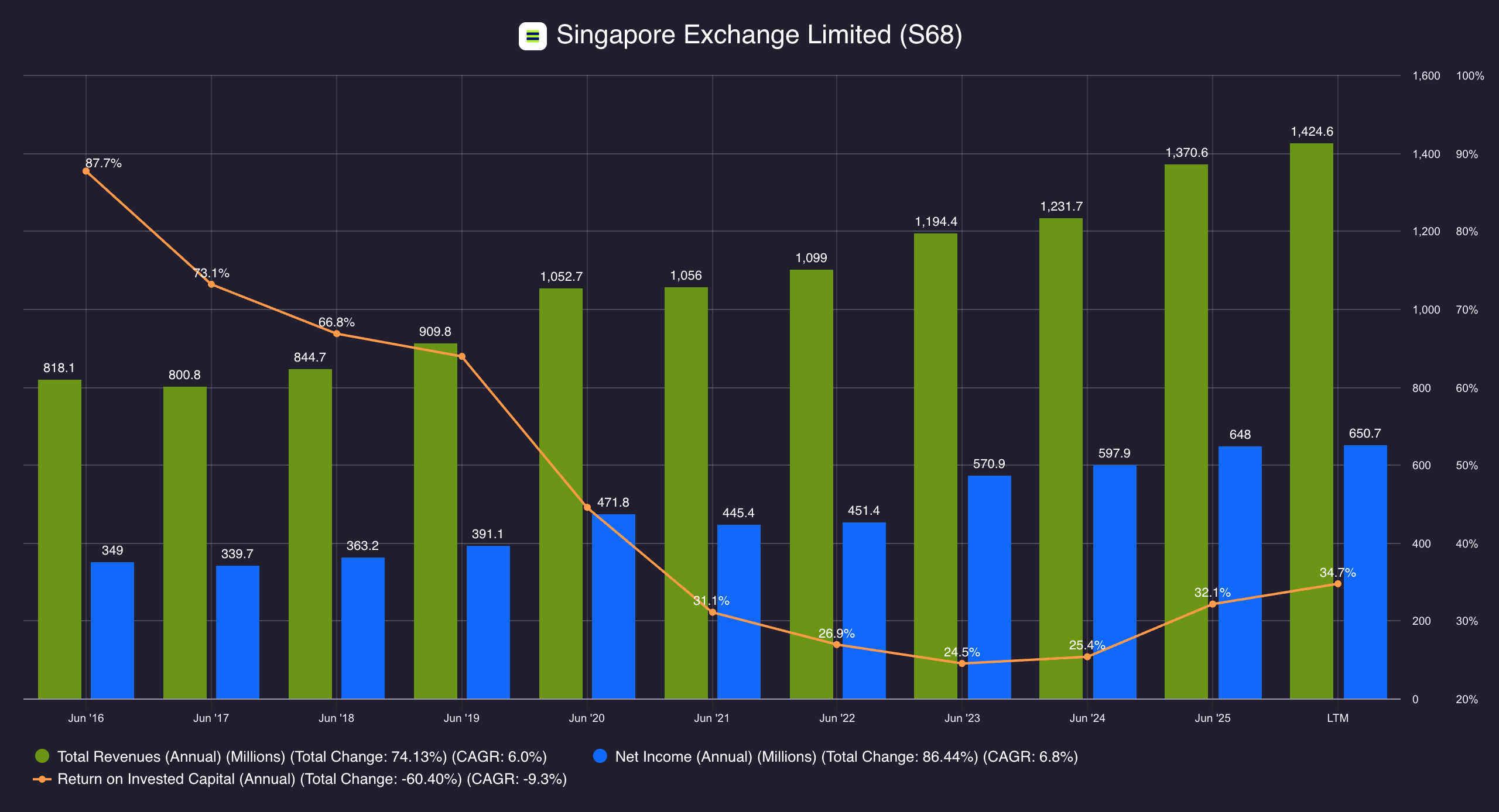 The numbers confirm the model is working. In FY2025 (year ending 30 June 2025), SGX reported operating revenue of S$1.37 billion — up 11.3% year-on-year — and adjusted net profit of S$609.5 million, up 15.9%. The strongest year in the exchange's listed history.3