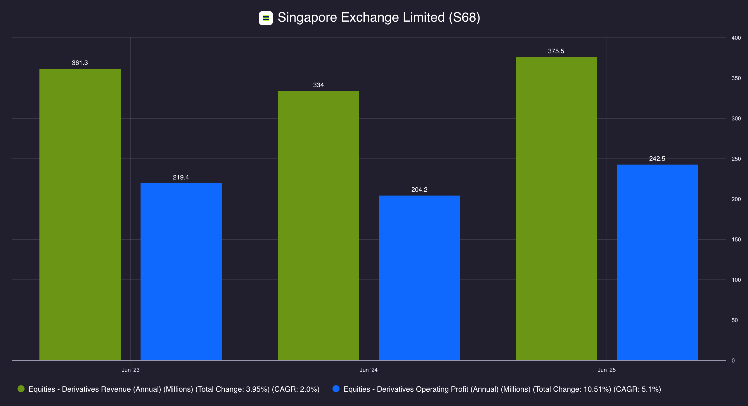 - Equities – Derivatives net revenue grew 13.8% to S$345.9 million in FY2025. Equity derivative volumes grew 10.3% to 175.8 million contracts. SGX FY2025 Annual Report. investor.sgx.com